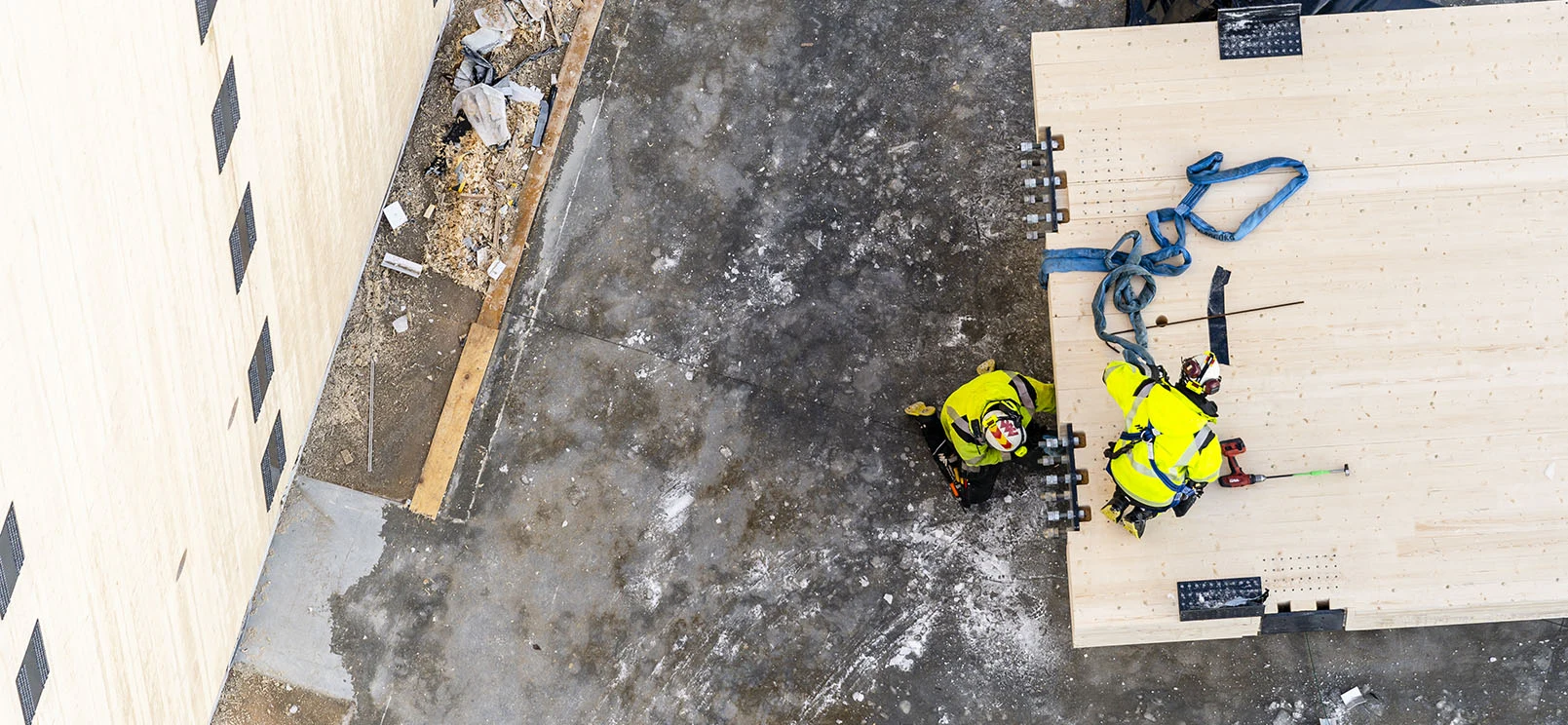 CLT is particularly easy and safe to build with because the insulation is on the outside. In Sweden, homes and offices are kept at around 20 °C, meaning that walls and joists are always warm and dry. In a stud wall with plastic sheeting on the inside, however, the construction only works as long as the plastic is completely sealed. If the sheeting is accidentally punctured, the risk of moisture problems increases. With CLT, however, there is no such problem – you can nail and drill as much as you want without risking damaging any sealant.