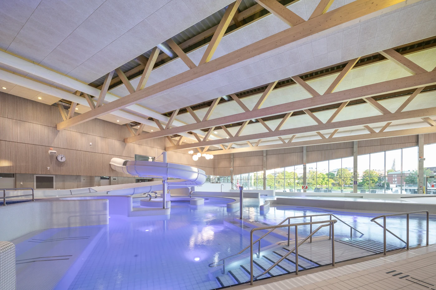 "Det klarer seg uten behandling i badeanlegg. Her er treet lakkert, men det er mer ut fra en flammehemmende funksjon. Som med alle materialer er det viktig å ha riktig skruer og beslag for det fuktige miljøet, men selve treverket egner seg svært godt her, sier André Rönnqvist, prosjektsjef hos Martinsons.