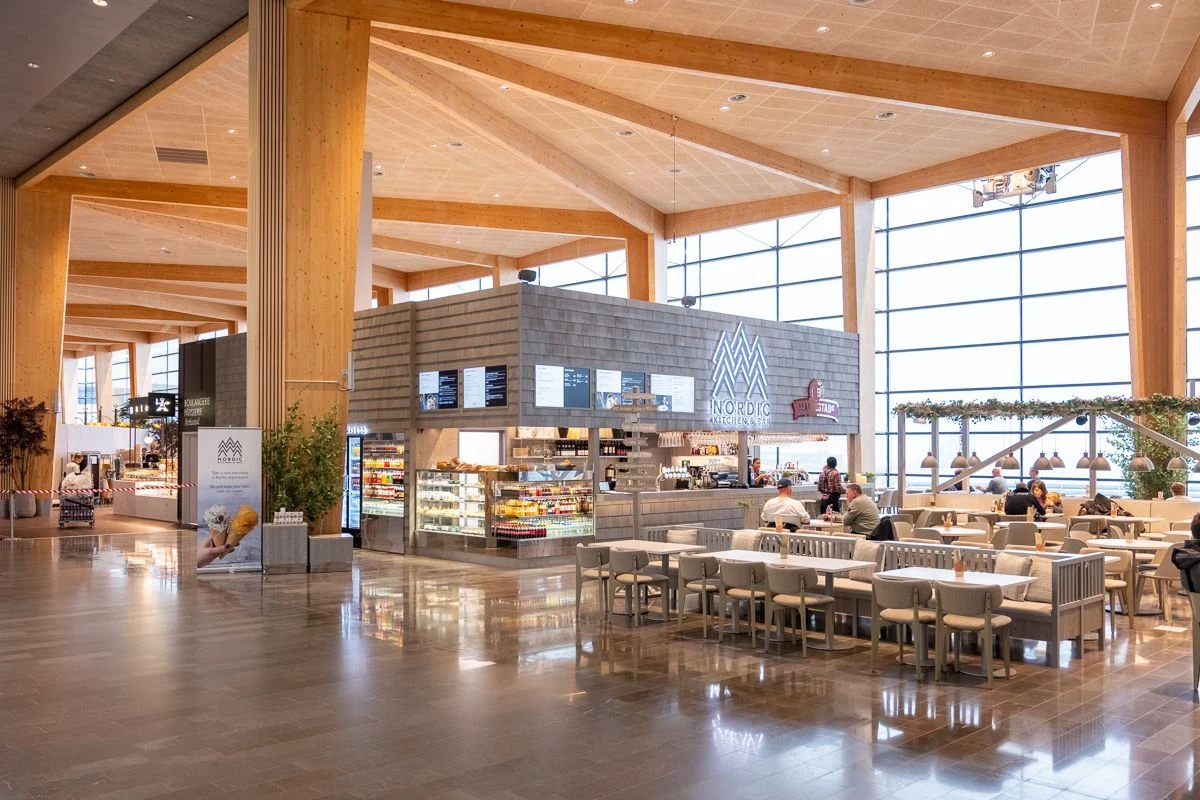 Allerede nå kan de besøkende oppleve følelsen av limtre. Etter innsjekking og sikkerhetskontroll kommer de reisende til flyplassens nye torg med butikker, restauranter og kafeer. Når det gjelder både arkitektur og utvalg, har torget et nordisk preg. Martinsons, som er en del av Holmen, har levert og montert bærekonstruksjonen i limtre og vært ansvarlig for prosjektering av konstruksjon og byggedokumenter.