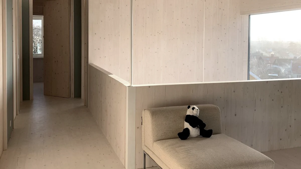 – De vågade tänka i lite nya banor och hade intressanta tankar om hur de ville att huset skulle bli. Resultatet blev en limträ- och KL-trästomme som består av pelare med sadelbalkar mellan pelarna. Dessa bär hela huset. Det massiva mellanbjälklaget i KL-trä är nedpendlat och hänger från sadelbalkarna i stag. En lite annorlunda konstruktion som är möjlig tack vare KL-träets flexibilitet, säger Daniel Wilded, produktchef på Martinsons.