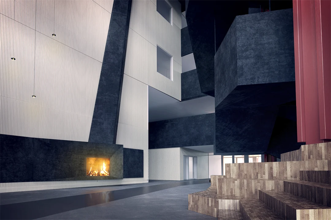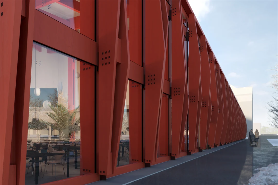 Den här nytänkande byggnadens pelarformationer och bärande limträbalkar bildar ett samiskt-inspirerat zigzagmönster, där ingen pelare är den andra lik.