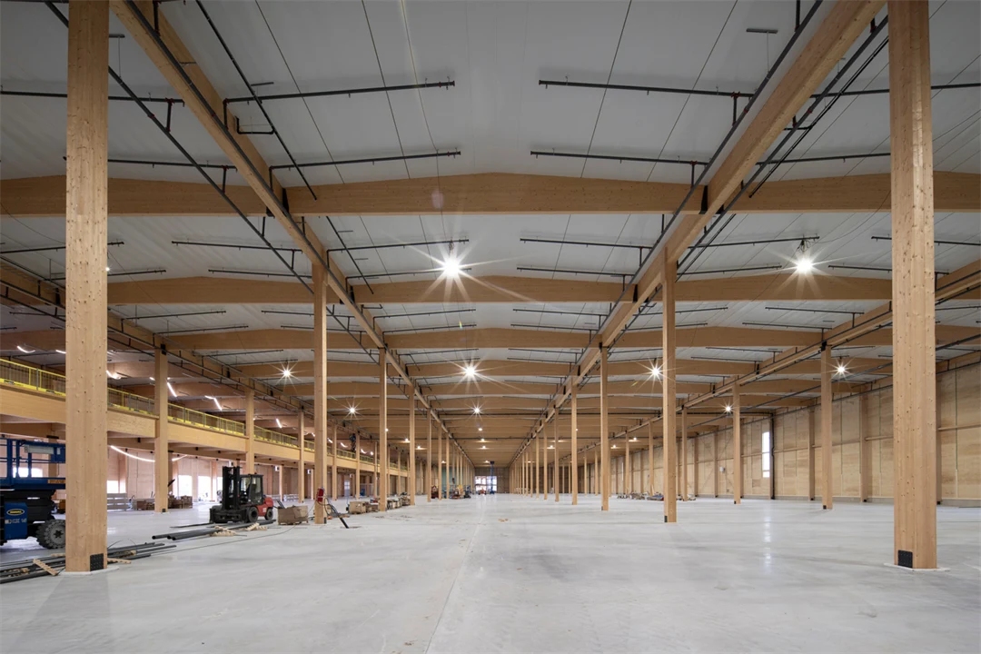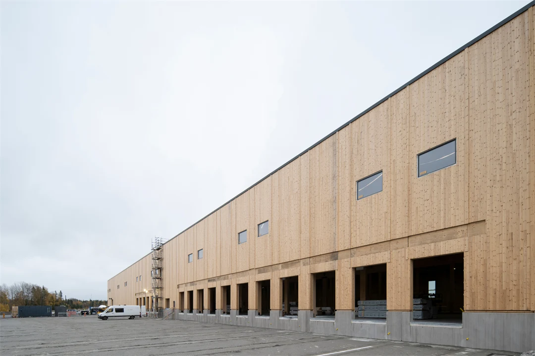 Projektet är en av de största logistikanläggningarna i landet som byggts i trä och är vägvisande med sin ambition att bygga med så låga CO2-utsläpp som möjligt.