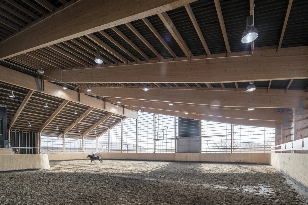 Vi har levererat 300 m3 limträ till en 3 000 m2 stor ridanläggning i skånska Klagshamn. Anläggningen omfattar en stor manege med läktare samt kansli, omklädningsrum, lektionssalar och café. Limträ var föreskrivet från början och beställaren ville att det skulle vara synligt eftersom det ger en varm och levande känsla och tydligt kopplar till den omgivande naturen. Ridanläggningen stod klar hösten 2015.