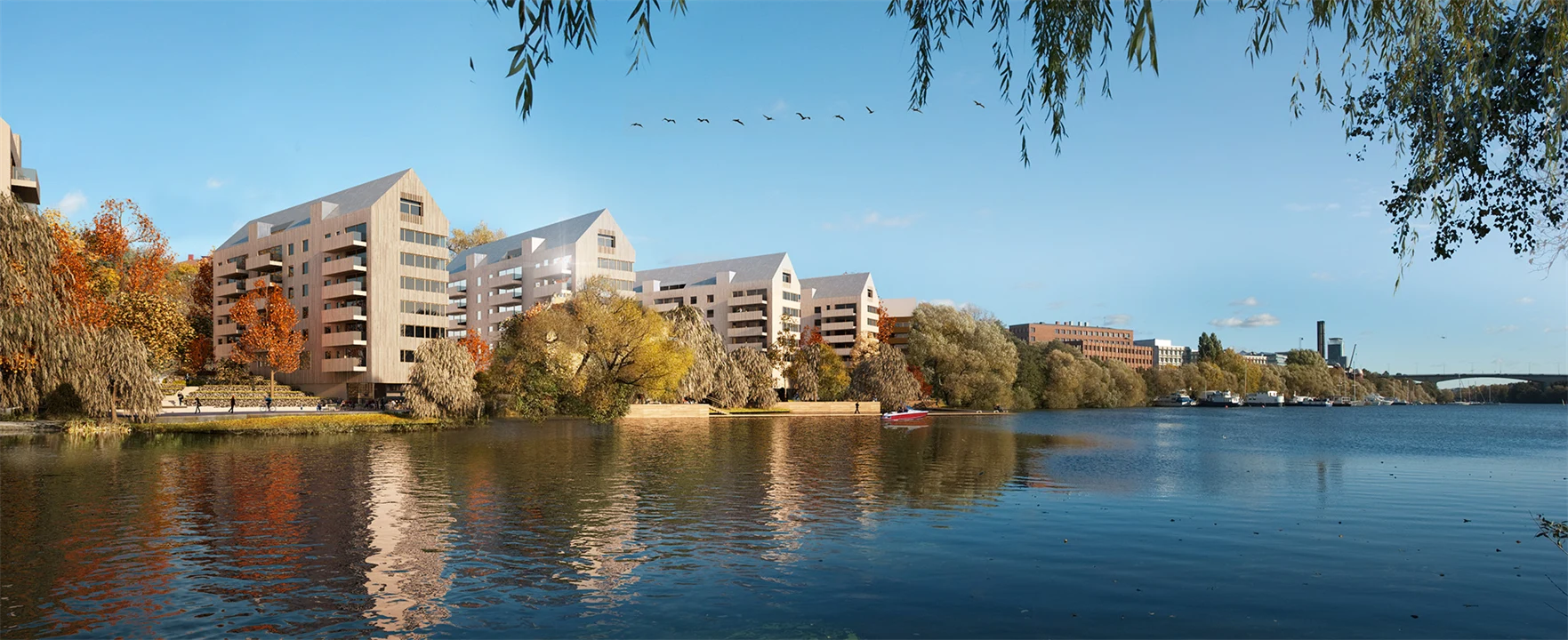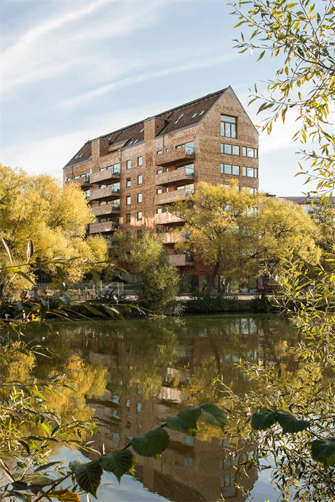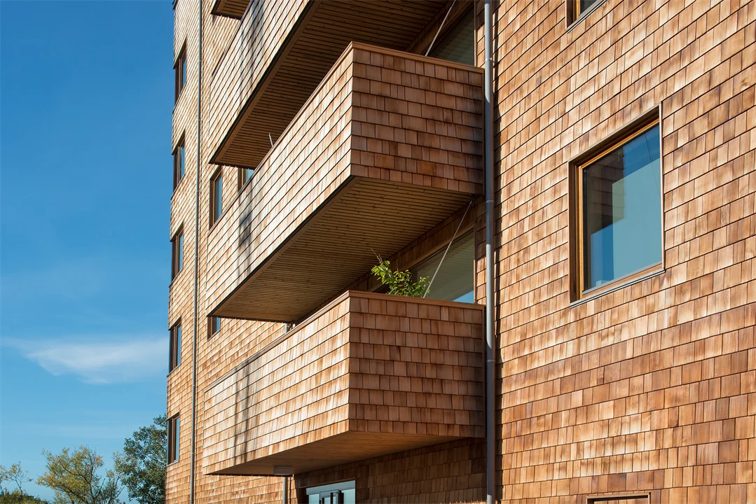Ett åttavåningshus med 31 lägenheter byggt i en kombination av limträ och KL-trä. Fasaden är beklädd med cederspån.